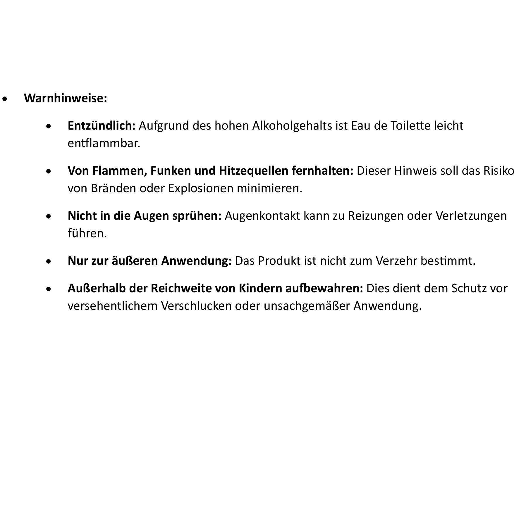 - Entzündlich: Aufgrund des hohen Alkoholgehalts ist Eau de Toilette leicht entflammbar.